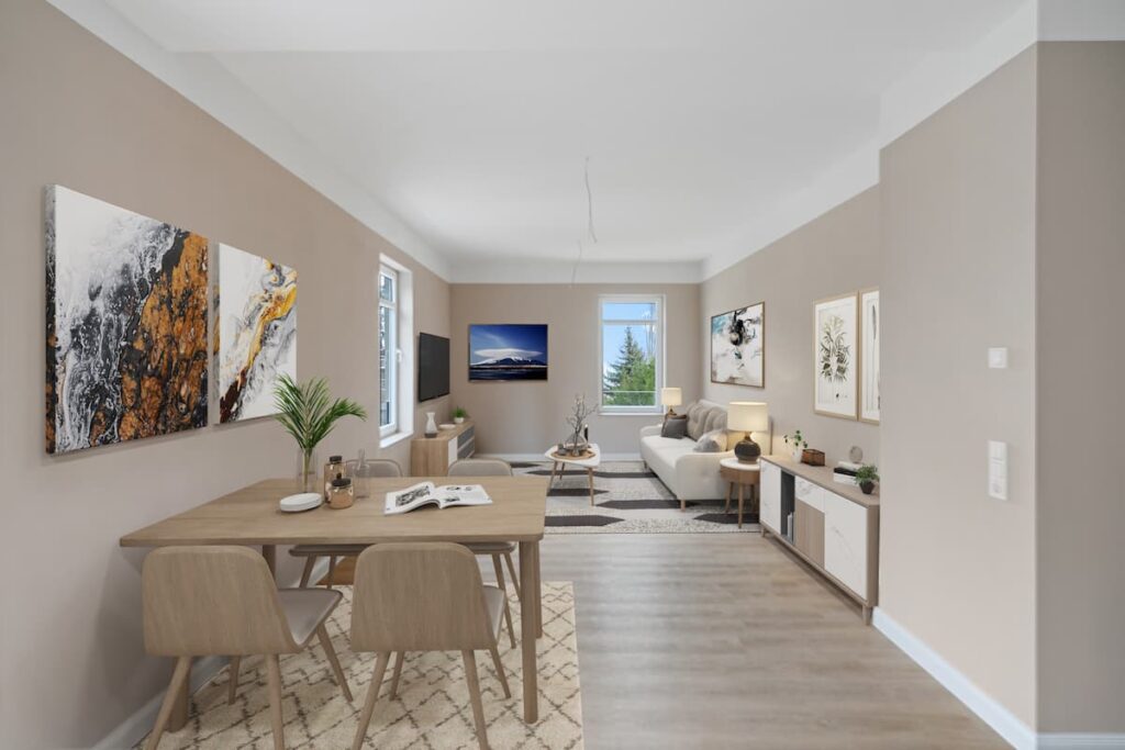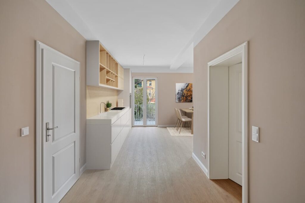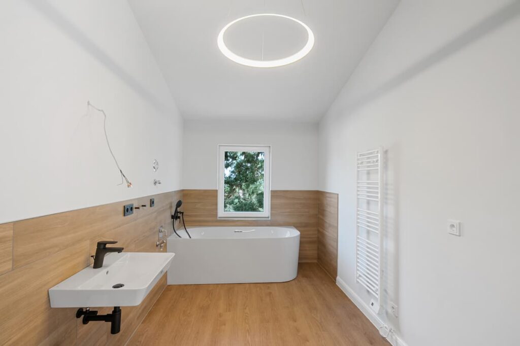 Im Dezember 2023 war es soweit: Die erste von neun Wohnungen in der Villa Harzer Forstamt war bezugsfertig. Die komplette Infrastruktur wurde erneuert, die Böden mit strapazierfähigem Vinyl-Belag versehen und die Wände mit umweltschonendem Lehmputz ausgestattet. Einige historische Elemente, wie die freistehende Badewanne und das Waschbecken im Badezimmer, konnten erhalten werden.